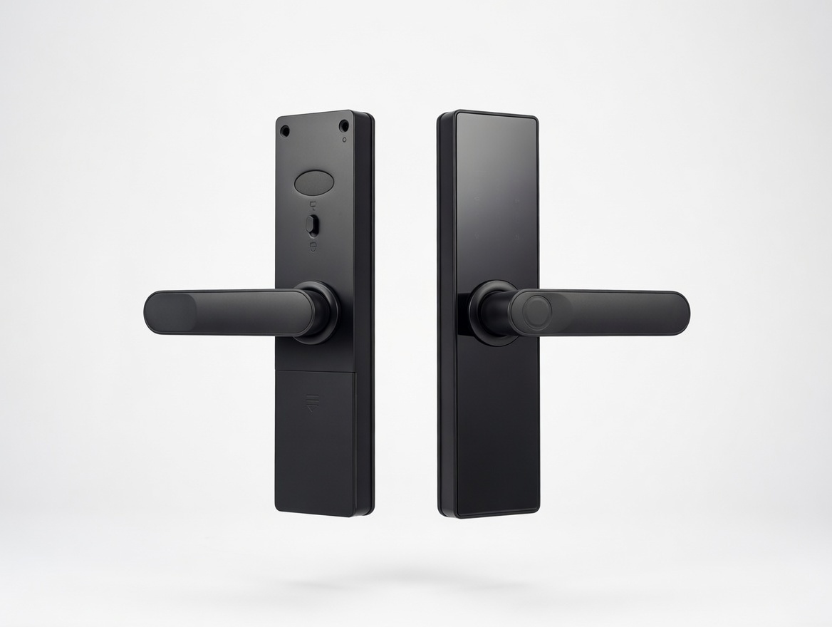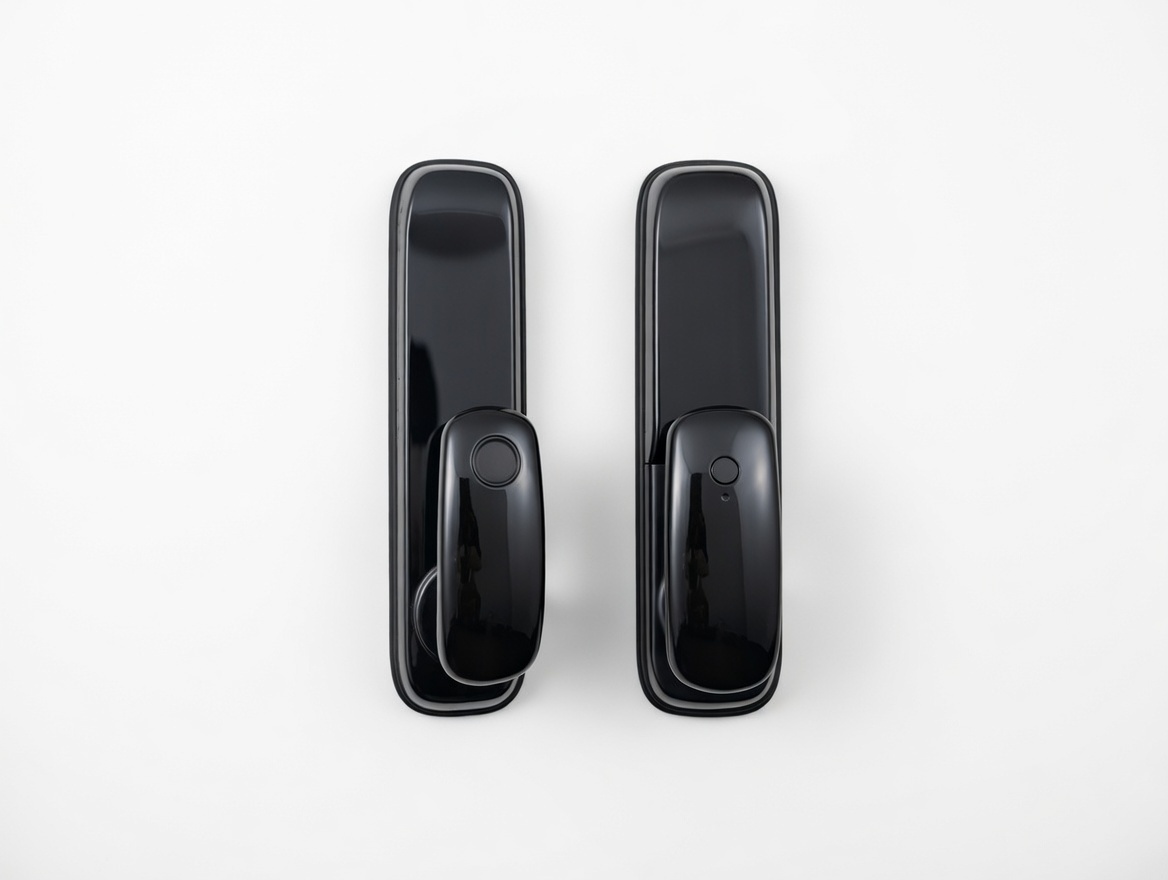 This sleek black smart door lock combines advanced biometric fingerprint recognition, touchscreen PIN entry, and mechanical key backup. Supports app control, auto-locking, and integration with smart home ecosystems. Ideal for front doors, offices, or rentals?easy installation with lever handles and durable construction for everyday use